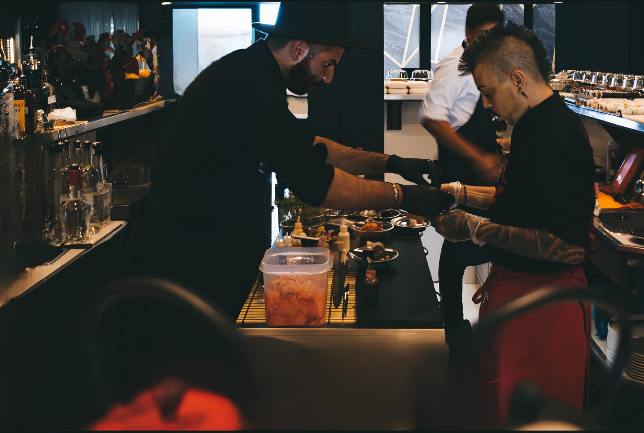 It was my first experience where I shared the workplace (a square divided in two) with a chef, where equipment, ice, stocks are shared, but above all ingredients, techniques and smiles are shared.